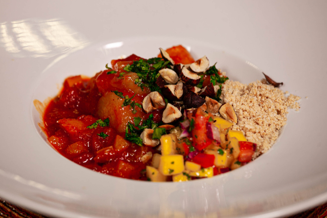 Experimentei, também, alguns insetos defumados que os povos indígenas comem e são preparados no moquém, um tipo de churrasqueira feita em madeira que mantém o peixe, insetos e farinha a uma distância que permita o cozimento lento. Conta-se que, além desses alimentos, os tupis no litoral do Brasil usavam o moquém também para assar a carne dos prisioneiros sacrificados. Como essa é uma coluna sobre gastronomia plant based (sem carne), vamos continuar focados na mandioca e preparar um cozido com um toque de defumação, uma inspiração da minha experiência na Amazônia.